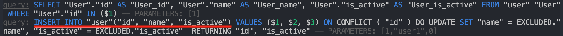 INSERT INTO "user"(id, "name", is_active) VALUES(1, 'user1', TRUE) ON CONFLICT (id) DO UPDATE SET "name"='user1', is_active=TRUE;repository.upsert()