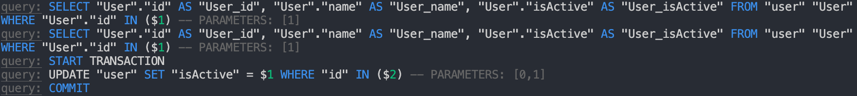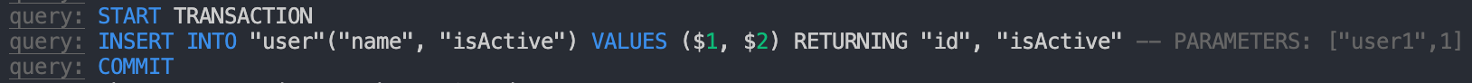 @Entity() class User { @PrimaryGeneratedColumn() id: number; @Column() name: string; @Column({ default: true, name: 'is_active', }) isActive: boolean; static create(name: string, isActive = false) { const user = new User(); user.name = name; user.isActive = isActive; return user; } disable() { this.isActive = false; } }엔티티를 하나 생성해서 저장하는 코드를 작성하고, 실제 전달되는 쿼리를 확인해보자.