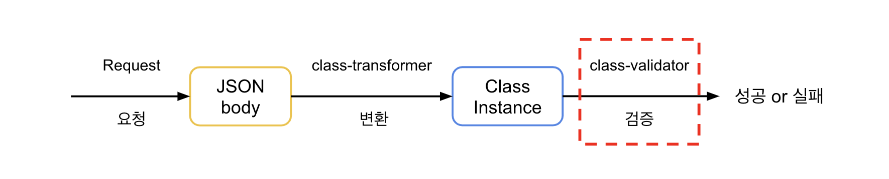 검증에 성공하면 plain object인 요청 body를 변환된 클래스의 인스턴스로 새로 할당해서 다음 미들웨어로 넘겨줄 수 있다.