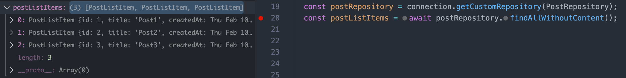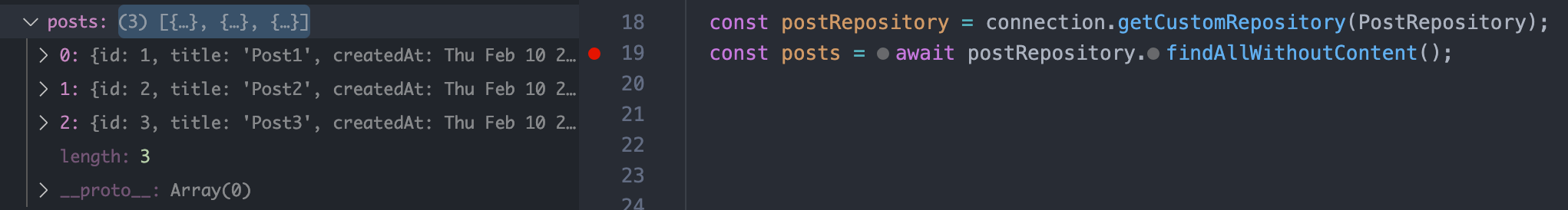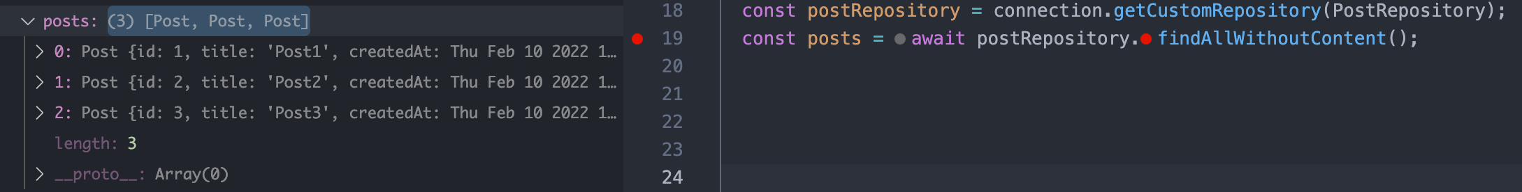 findAllWithoutContent()라는 메서드를 구현한다. 그리고 이 메서드를 이용해서 Post들을 조회해보자.@EntityRepository(Post) export class PostRepository extends Repository<Post> { findAllWithoutContent() { return this.createQueryBuilder('post') .select([ 'post.id', 'post.title', 'post.createdAt', ]) .getMany() } }const postRepository = connection.getCustomRepository(PostRepository); const posts = await postRepository.findAllWithoutContent();디버그 툴을 이용해서