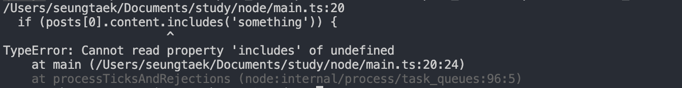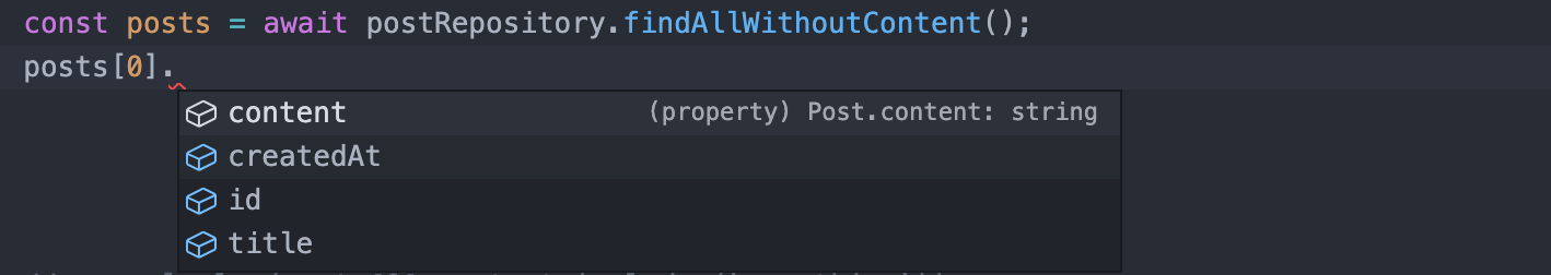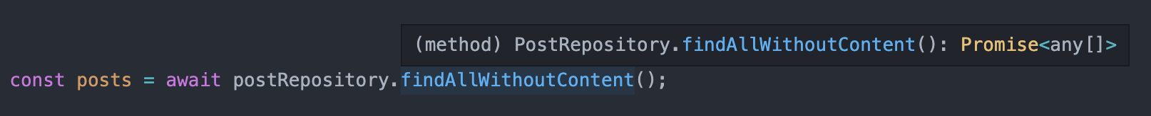 const postRepository = connection.getCustomRepository(PostRepository); const posts = await postRepository.findAllWithoutContent(); if (posts[0].includes("something")) { // do something... }결국 위 코드는 런타임에 오류가 발생한다는 것을 알게 된다.