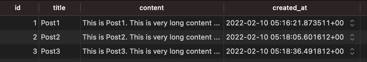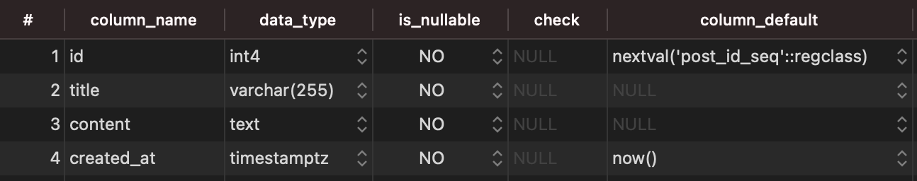 위와같은 요구사항이 있고, Post 테이블의 스키마는 다음과 같다. 데이터는 3개만 넣어놓았다.