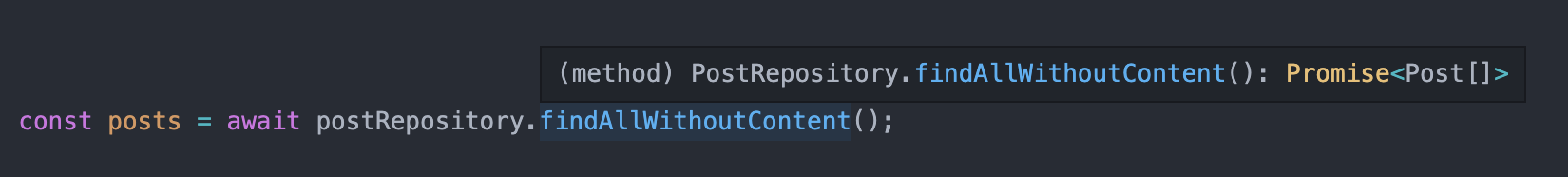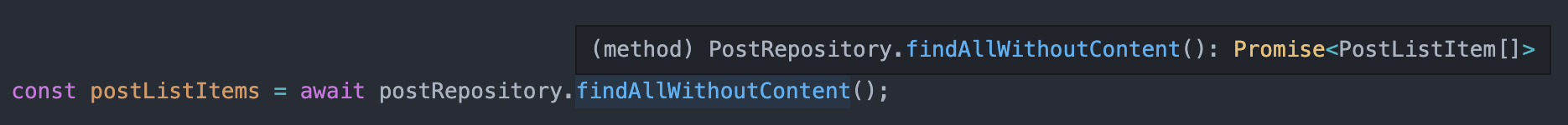 findAllWithoutContent()메서드가 클래스의 인스턴스를 리턴하는 것을 확인할 수 있다. 또한 이제 타입스크립트 컴파일러가 리턴 타입을 알고 있기 때문에 프로그램을 작성하는 시점에 먼저 얘기했던 문제 상황을 방지할 수 있다.