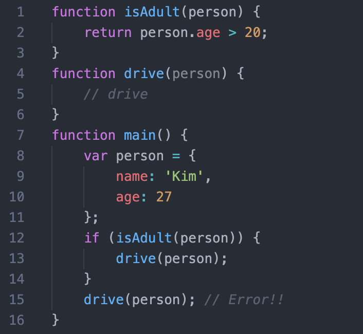 interface Person { name: string; age: number; } type Adult = Person & { _brand: 'adult' } function isAdult(person: Person): person is Adult { return person.age > 20; } function drive(person: Adult) { // drive } function main() { const person = { name: 'Kim', age: 27 }; if (isAdult(person)) { drive(person); } drive(person); // Error!! }Person 타입을 매개변수로 하는 isAdult() 라는 함수를 정의하고, 타입스크립트 컴파일러에게 이 함수의 return값이 참이면 매개변수로 주어진 변수는 Adult 타입이라고 판단하게 만들었다.