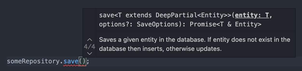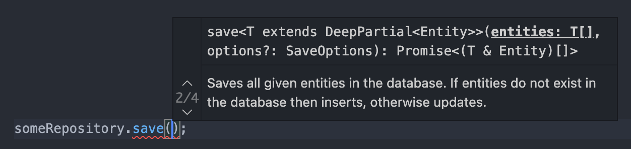 TypeORM 공식문서 그리고 VS code 같은 IDE의 Intellisense를 통해, save메소드에 단일 객체를 넘겨주면 단일 객체를 resolve하는 Promise를, 배열을 넘겨주면 배열을 resolve하는 Promise를 반환한다는 것을 알 수 있다.