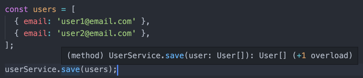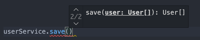interface User { email: string; }class UserService { private _users: User[] = []; save(user: User) { this._users.push(user); return user; } }saveUser 메소드에 반환 값의 타입을 명시하지 않았지만, 똑똑한 타입스크립트 컴파일러는 이 메소드가 받는 매개변수의 타입을 통해 반환 타입을 알 수 있다. 이 메소드를 사용할 때 VS code의 Intellisense를 통해 이 save 메소드의 매개변수의 타입과 반환 값의 타입을 확인할 수 있다.