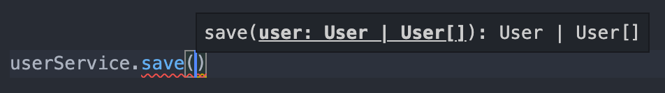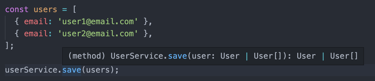 class UserService { private _users: User[] = []; save(user: User | User[]) { if (Array.isArray(user)) { this._users.push(...user); } else { this._users.push(user); } return user; } }이제 save메소드에 단일 객체와 배열 모두 넘겨줄 수 있게 되었다. 그런데 이제는 타입스크립트 컴파일러가 매개변수의 타입과 리턴 타입을 매치해서 알려주지 못하는 것을 확인할 수 있다.