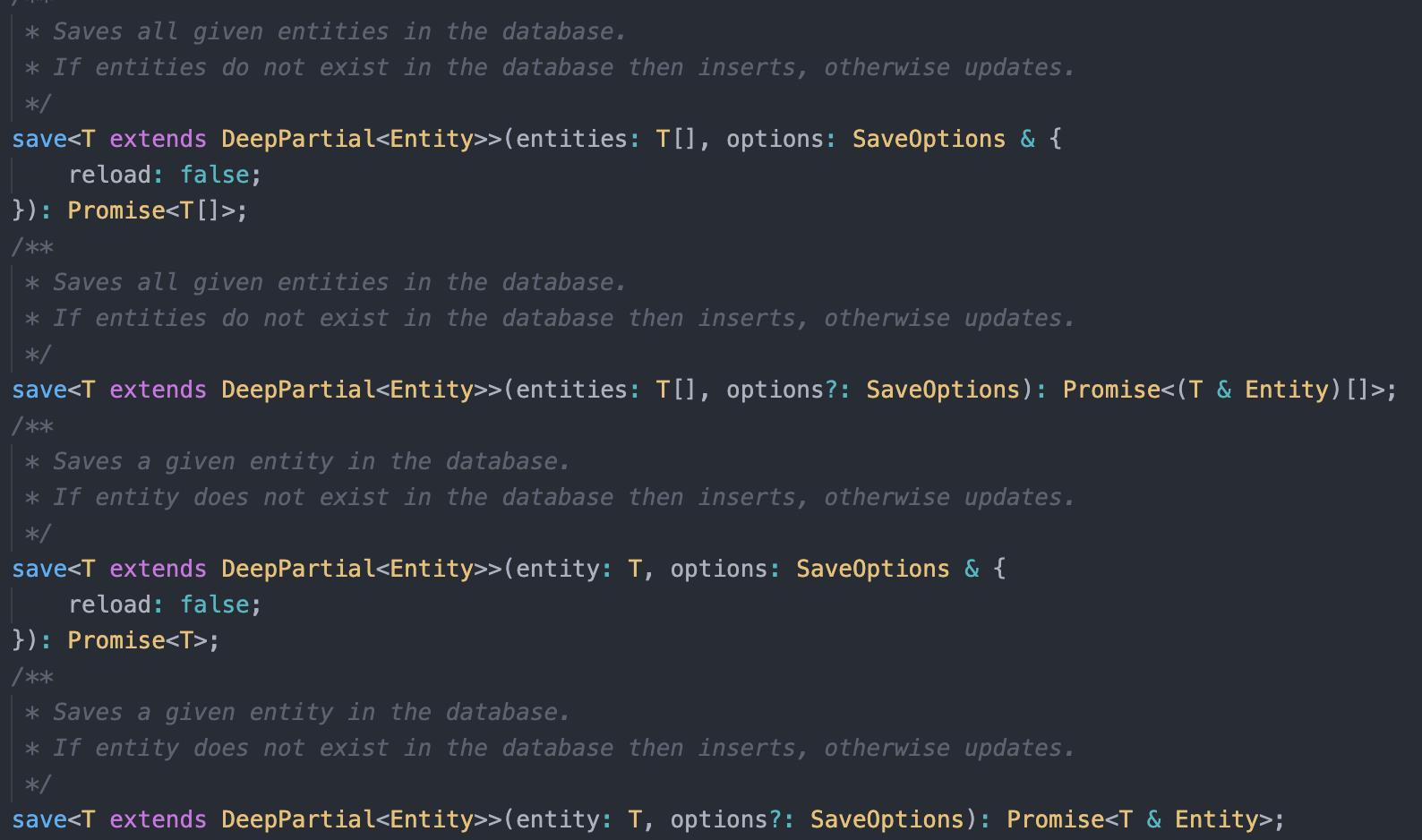 TypeORM 공식문서 그리고 VS code 같은 IDE의 Intellisense를 통해, save메소드에 단일 객체를 넘겨주면 단일 객체를 resolve하는 Promise를, 배열을 넘겨주면 배열을 resolve하는 Promise를 반환한다는 것을 알 수 있다.