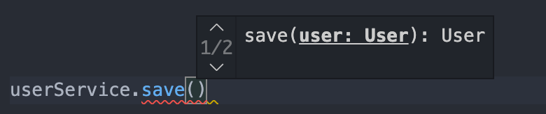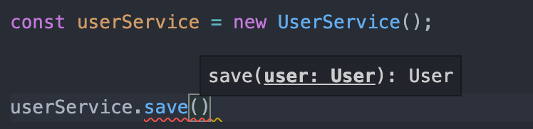 interface User { email: string; }class UserService { private _users: User[] = []; save(user: User) { this._users.push(user); return user; } }saveUser 메소드에 반환 값의 타입을 명시하지 않았지만, 똑똑한 타입스크립트 컴파일러는 이 메소드가 받는 매개변수의 타입을 통해 반환 타입을 알 수 있다. 이 메소드를 사용할 때 VS code의 Intellisense를 통해 이 save 메소드의 매개변수의 타입과 반환 값의 타입을 확인할 수 있다.