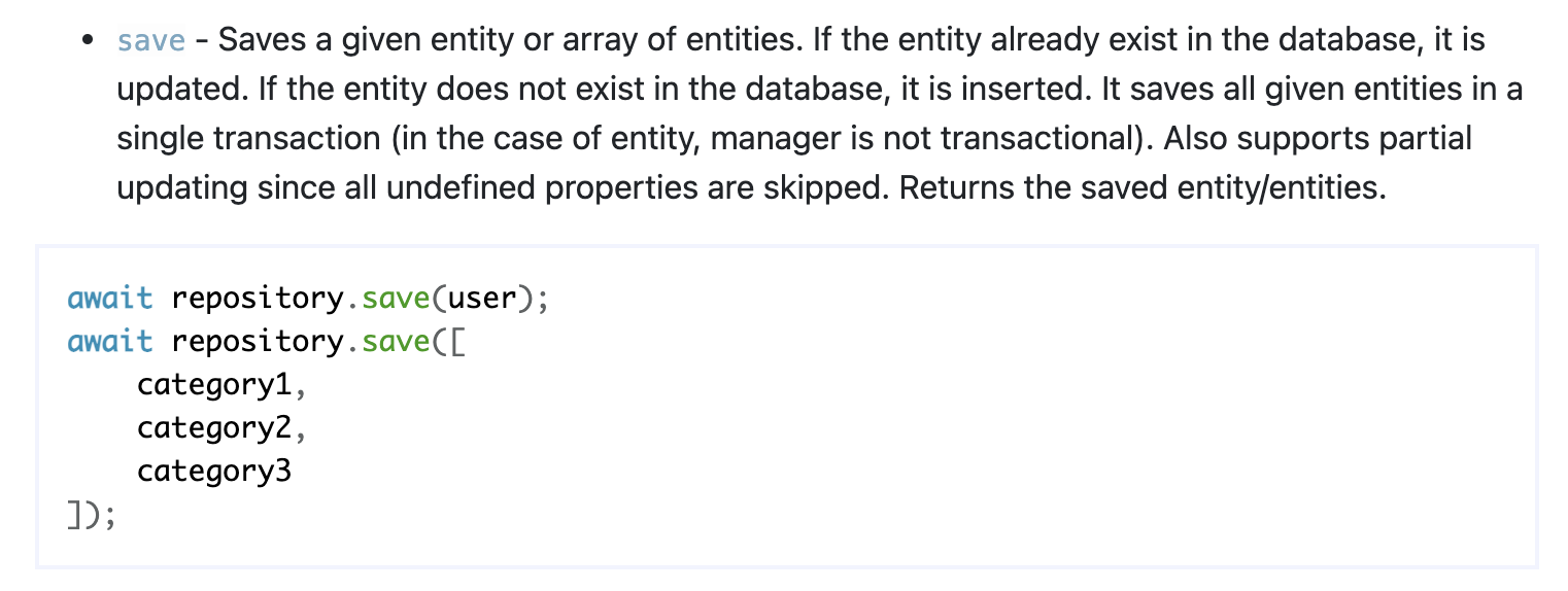 최근에 유용하게 사용하고 있는 TypeORM 이라는 Typescipt의 ORM 라이브러리는 데이터를 저장하는 함수로 repository 클래스의 save라는 메소드를 제공한다.